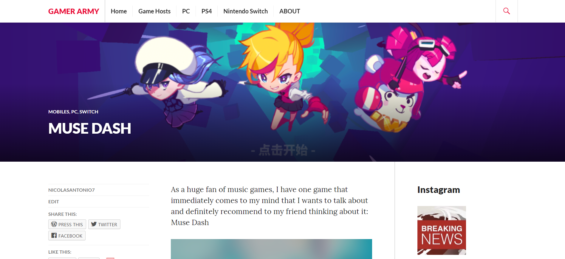 This post is about a music game I loved very much. It’s called “Muse Dash”. All of the images are screen shots taken by me, It is easy to see that I’ve put a lot of images about the game, and the content of the paragraphs are linked with the image. Then is the side bar on the side, for mine, I choose to use my Instagram account, in the side bar you can see some post like my recommendation for some games or some announcement sometimes. Then at the end of this article, I created a portal (hyperlink) to the game’s trailer you can click on. At the bottom of this page, is the comment section, and some link to my other articles.